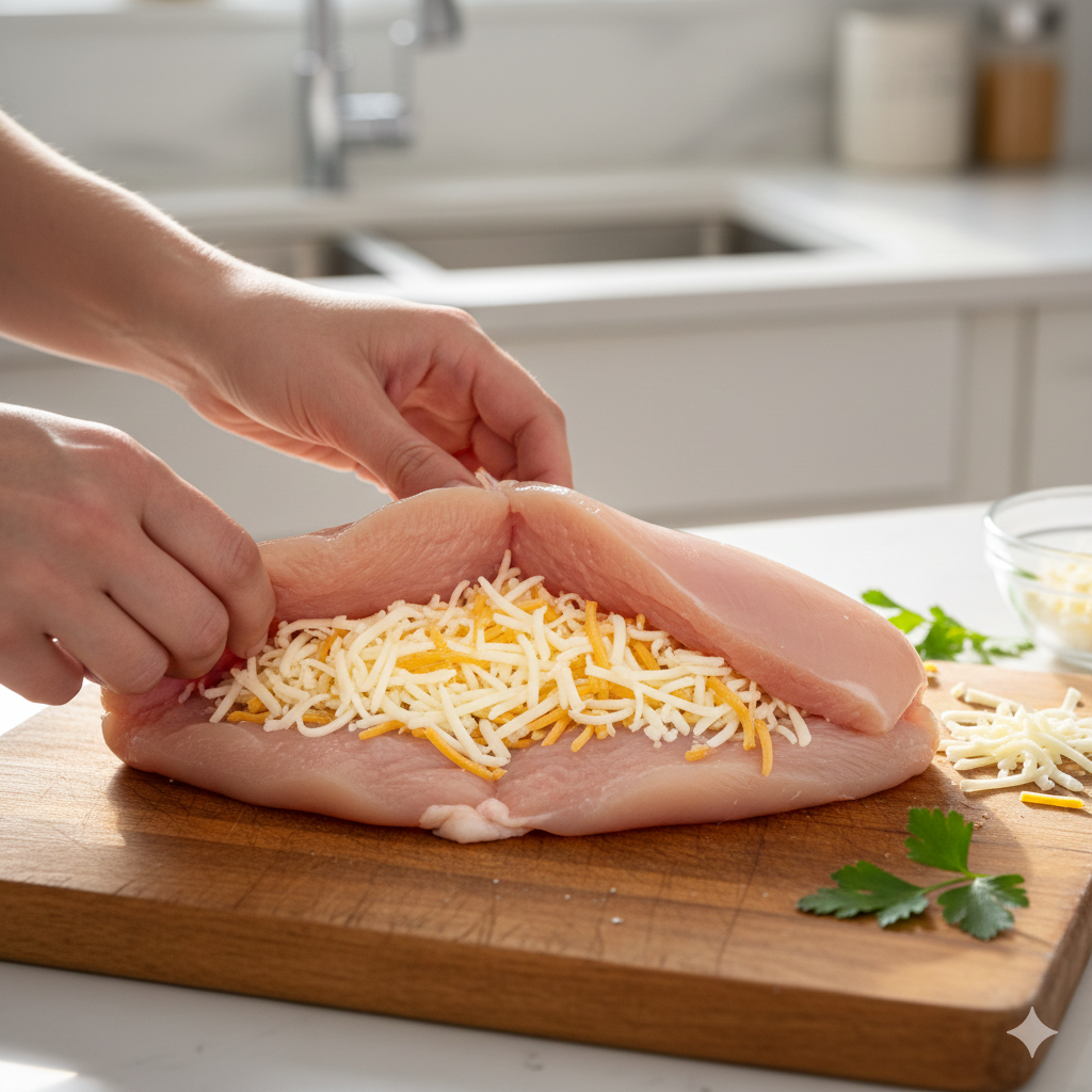 Coloca el queso en el centro de cada pechuga, procurando no llegar a las orillas para evitar que se salga al cocinar. Dobla el pollo cubriendo el relleno y, si lo deseas, asegura con uno o dos palillos.